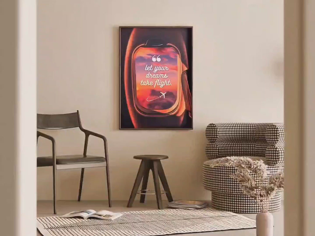 Bring a touch of inspiration and wanderlust to your walls with our Dream Quote Twilight Poster. This stunning airplane window wall art captures the serene beauty of a twilight sky with vibrant sunset clouds in a dreamy oil painting style. Perfect for adding a sense of adventure and optimism to your home or office, this fly sky inspirational print is a must-have for anyone who loves the open sky and the endless possibilities it represents.